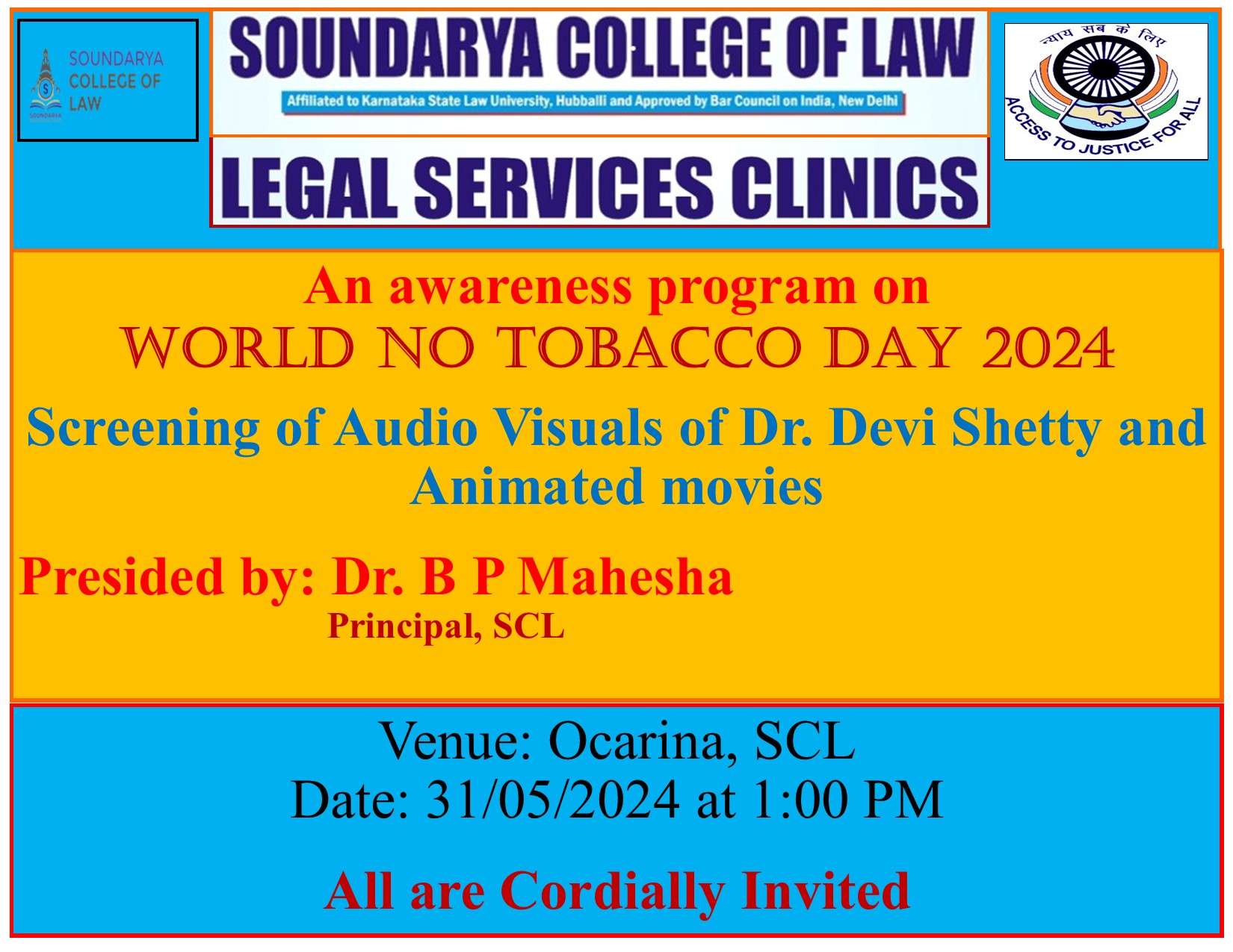 The Legal Service Clinics and NSS of Soundarya College of Law teamed up together for creating awareness on the implications of tobacco and its allied products on health. The youths both in urban and rural areas are now addicted to use of tobacco products, narcotic drugs and psychotropic substances which affects their life and also adversely affecting their family members. By this awareness program students were been advised not use tobacco products and also educate their relatives and family members not to use these products. To make understand the ill effects of tobacco abuse audio visuals of Dr. Devi Shetty and Animated movies were screened. Mr. Abhijith, Asst. Professor was MC and Dr. B P Mahesha delivered his Presidential remarks reiterated that use of tobacco products leads to cancer and may result in death causing loss of dependency.
