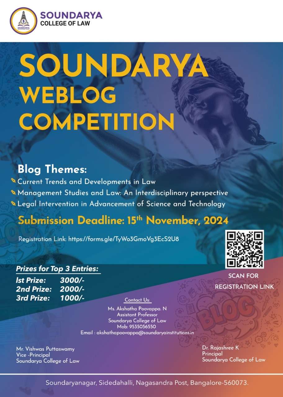 Soundarya Weblog is an online blog writing competition that brings together talented writers, including students, research scholars, legal practitioners, and researchers. This competition aims to build a community of intellectuals who can share insights on contemporary issues. SCL is dedicated to inspiring future generations, improving writing skills, and motivating writers.
