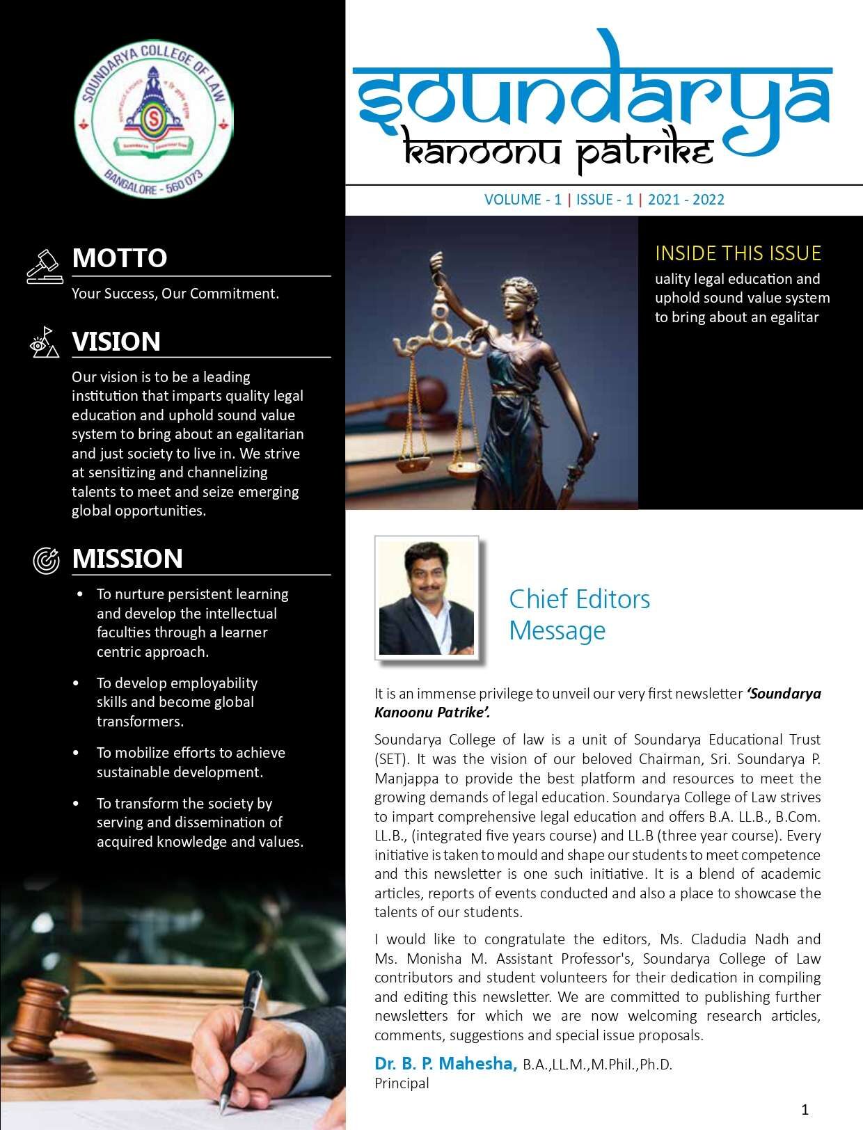 The Newsletter Committee of Soundarya College of Law serves as the official editorial body responsible for documenting, curating, and publishing the academic, co-curricular, and extracurricular achievements of the institution. It acts as a bridge between the college and the outside world by showcasing the vibrant activities of the college. It aims to create a dynamic platform that highlights the activities, achievements, opinions, and creative contributions of students and faculty members, thereby fostering a strong sense of community and academic pride.